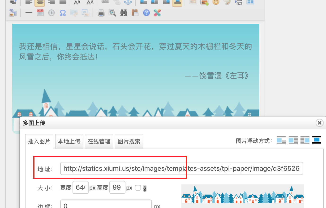 做完了前3步,你的UEditor已经可以做到和本页面的示例一样的功能了, 不过,由于秀米提供的图片地址不能直接应用在你的网站中,你需要将秀米的图片通过UEditor 的图片上传功能把图片转存到你自己的服务器上,否则会造成图片无法显示。